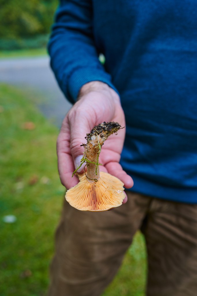 Aber mein persönliches Pilzwissen hatte sich am Ende dieser Tour vervielfacht. Reinhard („Wir Pilzfreunde duzen uns.“) ist ein wandelndes Pilzlexikon, logisch. Auf ganz unnachahmliche, ruhige und äußerst zugewandte Art hat er zudem die Fähigkeit, Menschen zu begeistern und komplexe Zusammenhänge anschaulich darzustellen. Dass dabei durchs Unterholz gewandert wird, Bäume und Böden sprichwörtlich unter die Lupe genommen werden, alle möglichen, auch teils ungenießbaren Pilze in die Hand genommen, gerochen und auseinandergenommen werden, ist ein sinnliches Spektakel. Wichtige Lektion für Anfänger: Die Fixierung auf den Speisewert von Pilzen ist hinderlich beim Begreifen der Gesamtthematik. Oder anders ausgedrückt: Wer nur nach Maronenröhrling, Pfifferling und Co. Ausschau hält – und enttäuscht ist bei ausbleibendem Erfolg – benimmt sich der wunderbaren Faszination, die das Universum der Pilze in seiner Gesamtheit ausmacht. Sich beispielsweise erstmals am Leuchten des Kirschroten Saftlings zu erfreuen, bleibt unvergessen.