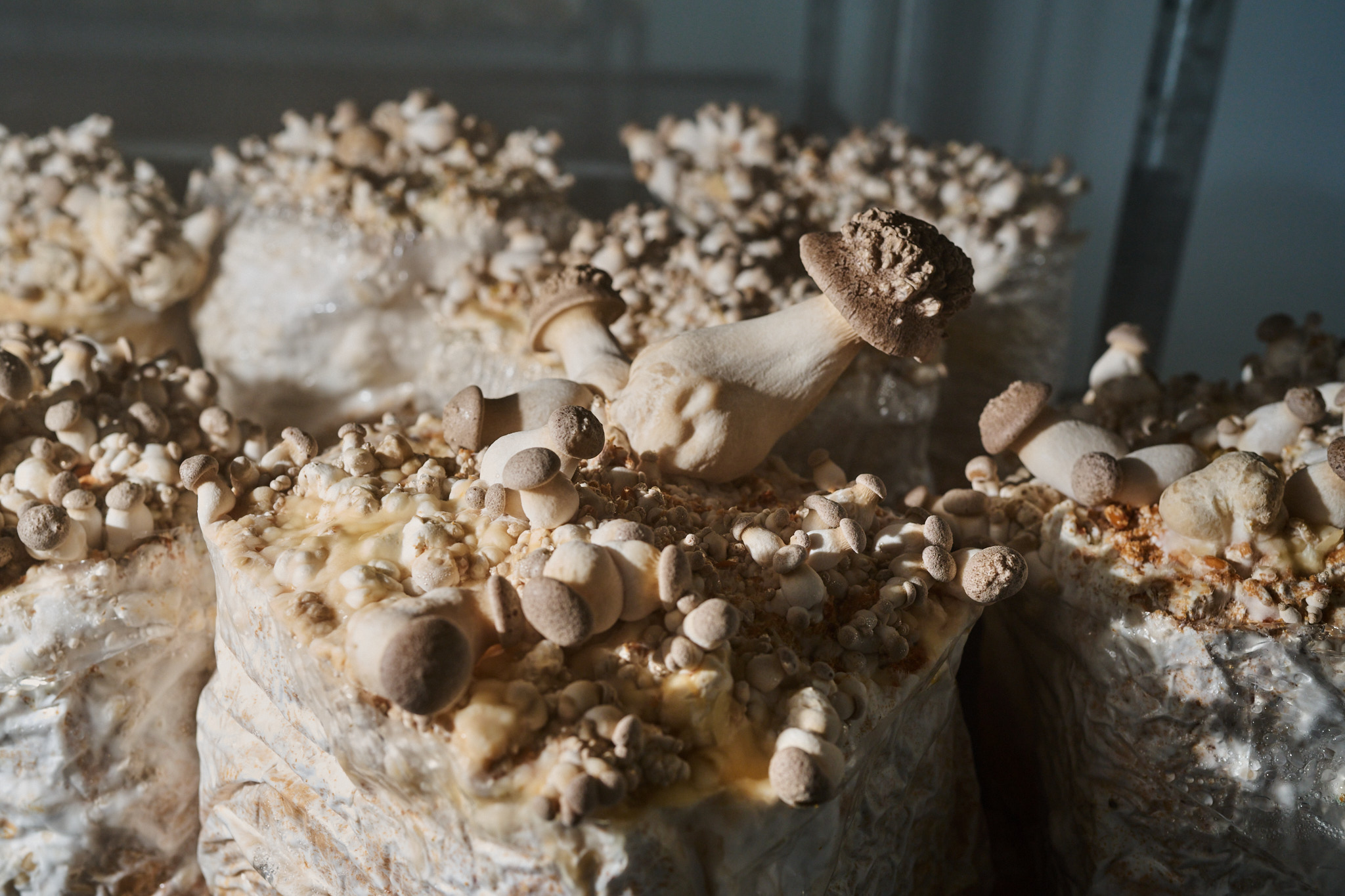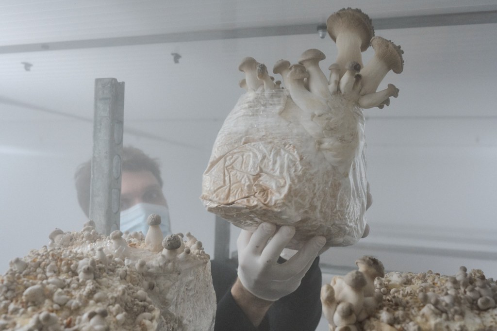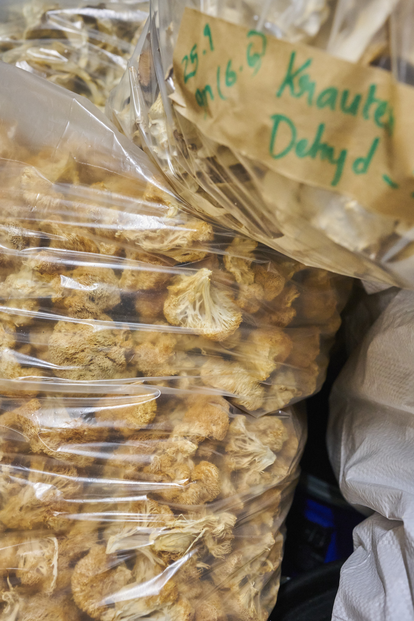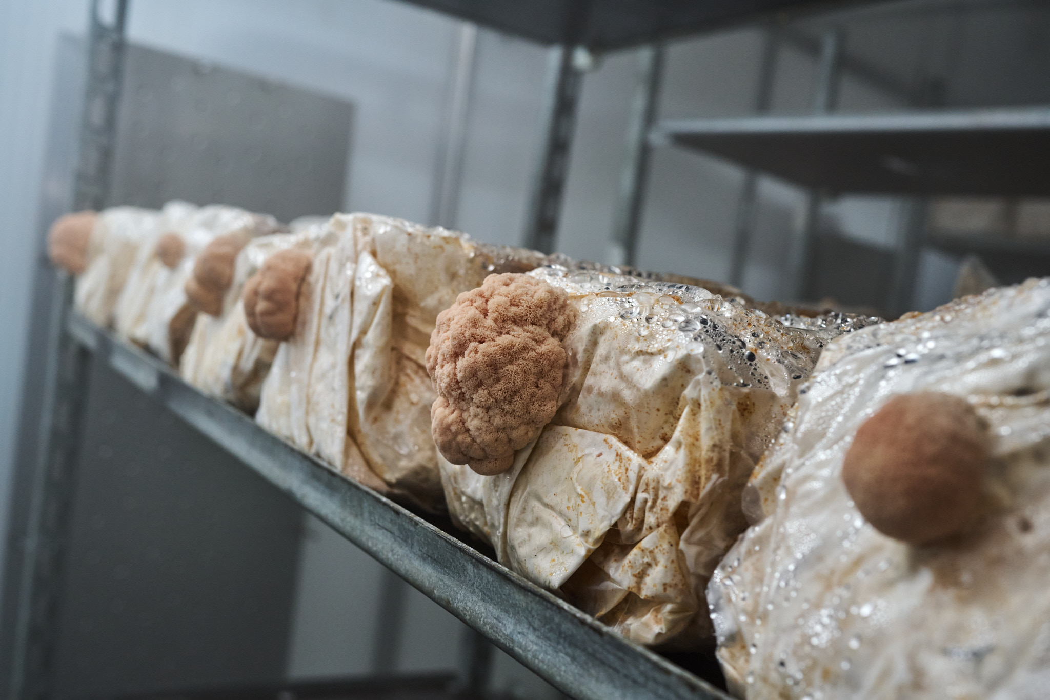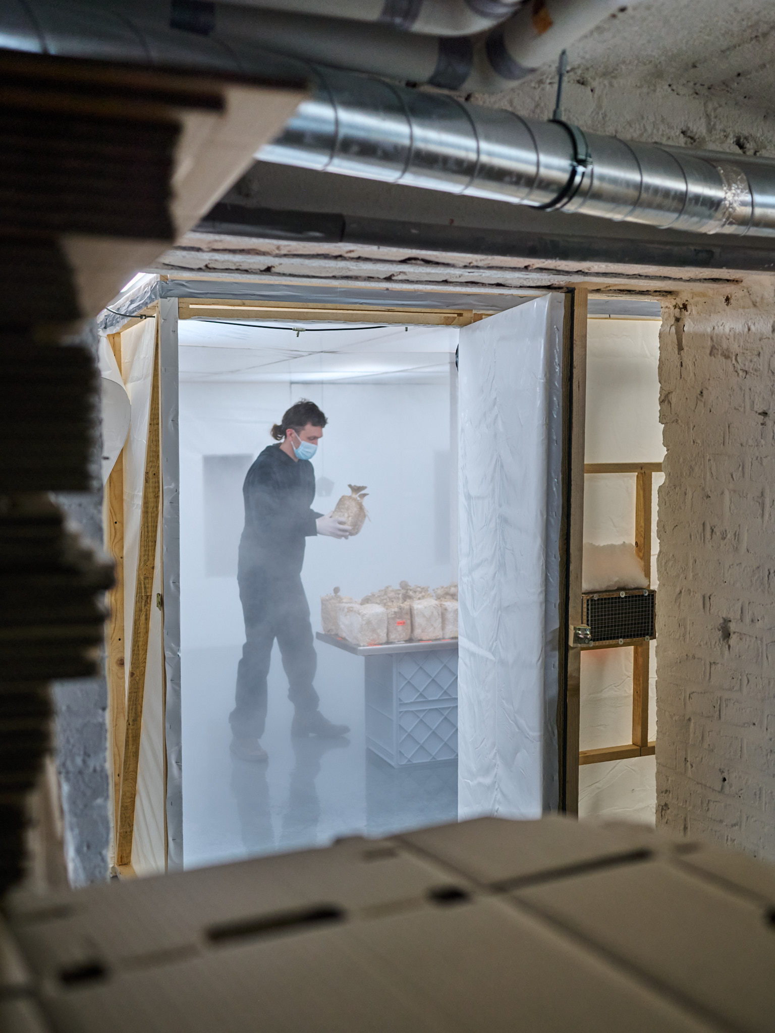 Doch liegen nicht alle Kölner Pilzvorkommen an der Oberfläche und sind frei zugänglich. Deshalb verabreden wir uns zwei Tage später mit Trevor Weiss im Hinterhof eines Hauses an der Plankgasse. Hier betreibt der Kanadier zusammen mit Christian Vetter unter dem Namen Pilzling Kölns erste urbane Pilzfarm. Die Idee dazu entstand ebenfalls zu Beginn der Pandemie. Die beiden wollten eine nachhaltige, landwirtschaftliche Produktion in der Stadt aufbauen und dabei möglichst die Ideen einer Kreislaufwirtschaft befolgen. Aber warum haben sie sich ausgerechnet für den Anbau von Pilzen entschieden? „Pilze benötigen weder große Flächen noch viel Wasser, was sie zu einer idealen Kulturpflanze für Städte macht. Sie gedeihen in kleinen Räumen, zersetzen organische Stoffe und verwandeln sie in köstliche Lebensmittel.“ Trevors Augen leuchten, als er uns die einige hundert Quadratmeter große, unterirdische Produktionsfläche zeigt. Hier wachsen auf einem selbst entwickelten Substrat aus Holzspänen und Roggenbruch prächtige Kräuterseitlinge, Klapperschwämme oder Pompon-blancs, auch Igel-Stachelbart oder Lion`s Mane genannt.