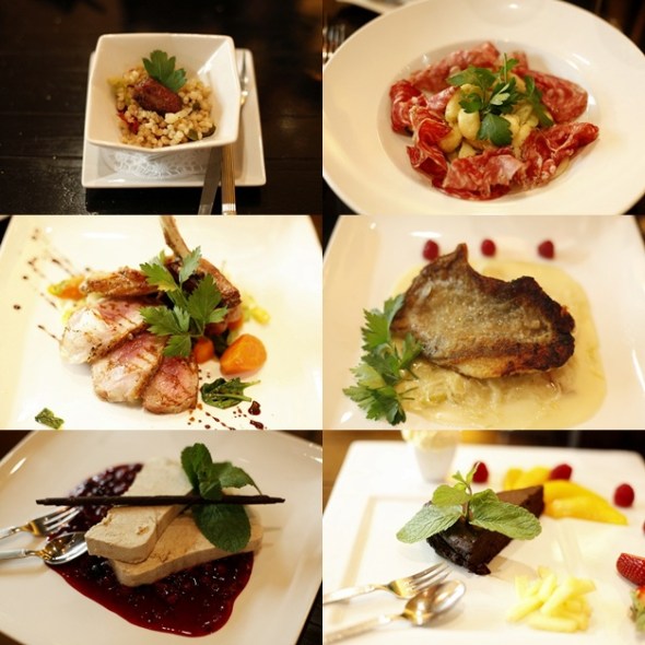 Man sieht 2 3-Gänge Menues + Gruß aus der Küche (oben links: Minibratwurst auf lauwarmem Graupensalat).