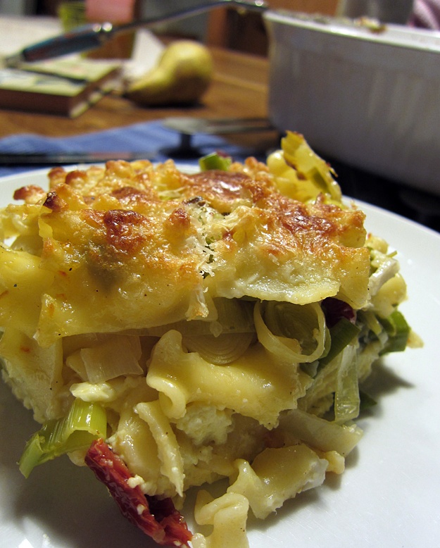 Mafaldine, Porree, halbtrockene Tomaten, EierSahneMilch, Pecorino sardo, Pfeffer, Salz. Soulfood.