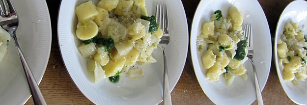 Gnocchi also. Schmecken gemeinhin mehlig, kleben am Gaumen und verkleistern Speiseröhre sowie folgende, tiefer liegende Körperkanäle. Warum? Weil selten jemand den status quo hinterfragt – das Sosein ist das Leitmotiv der Faulen. Beim Schreiben dieser Zeilen wird der Gaul unruhig, gleich geht er durch mit mir. Ich erspare es den ein bis zwei Lesern hier, publiziere lieber demnächst ein Buch über Herd-Dogmatik und komme ganz praktisch auf den Punkt: In Kartoffelklöße gehört kein Weizenmehl – auch nicht in Italo-Miniaturen. Es gibt dazu sogar eine bestens dokumentierte Versuchsreihe. Wenn auch mit zweiflerischem Ergebnis – ich hingegen bin überzeugt, dass es nur so geht: