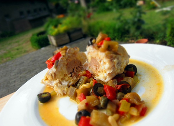 an ein Trinkerlebnis auf Sizilien, irgendein gespritetes Kaugummiwasser, dass aber perfekt passte zum süßen Couscous. Mein Inselgenussfavorit ist jedoch die Caponata. In die häufig auch Rosinen gelangen – ich mag aber ebenso die Variante mit Kapern. Und ließ mich zudem inspirieren von einer Idee Nino Grazianos, der auf dem fast fertigen Gemüse mit Garnelenschwänzen gefüllte Brassenrollen gart. Hier: Mit Thunfischloin gefüllter Kohlfisch.
