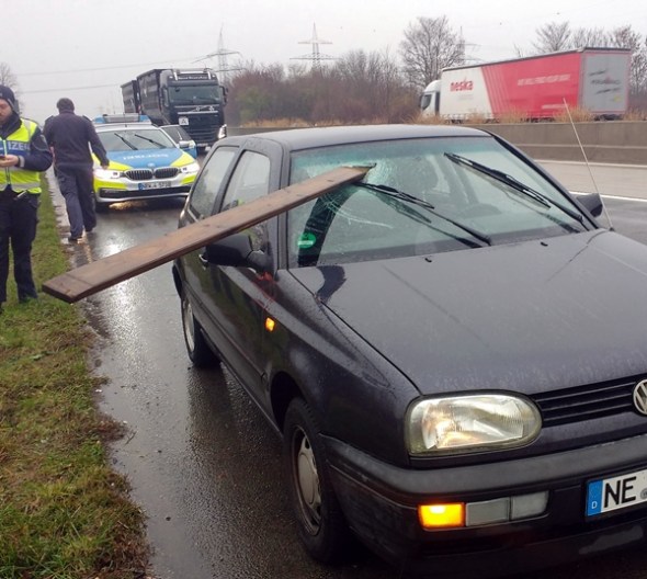 Der Rest könnte sein: Polizei, Feuerwehr, Rettungswagen, ADAC. Weiche Knie, Traumatherapie. Wenn da nicht kurz nach uns ein weiteres Fahrzeug halten würde. Ein Transporter mit einem Anhänger. Darauf eine Weihnachtsmarktbude. Gezimmert aus Holzlatten. Der Fahrer steigt aus. Wir auch, endlich. Er geht um unser Auto herum. Beugt sich über den Kühler. Betrachtet das Loch im Glas und ganz genau die Latte. Sagt „Nicht meine“ steigt in sein Fahrzeug und fährt davon.