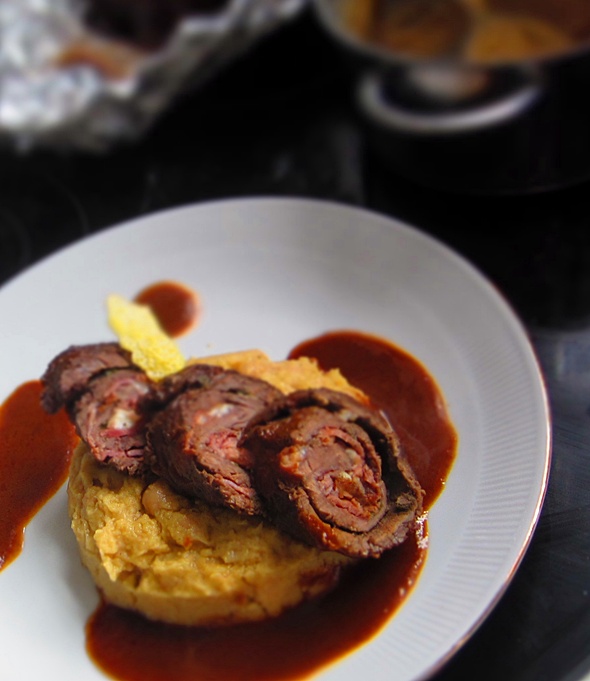 Nun zum Essen. Ich aß diese Pferderouladen in Bari, klar, und eigentlich in jedem apulischen Kaff bis runter nach Lecce. Oft. Ich mag halt Pferde. Was die Variante von Bari besonders macht, ist die Füllung: Pancetta, Petersilie und Caciocavallo. Dieser Pferdekäse passt natürlich wie nichts anderes in die Fleischrollen. So habe ich auch heute alles andere weggelassen. Etwas Salz und Pfeffer, gut. Dann das Fleisch rundum angebraten, wieder aus dem Bräter hinaus und Mirepoix hinein und wie bei fast jedem italienischen Schmorgericht weitergemacht (angeröstet, Tomatenmark dazu, ebenfalls geröstet, Rotwein, einkochen, nochmal, und so fort…). Schließlich das Fleisch wieder eingesetzt – bei nicht zuviel Flüssigkeit, es soll ja schmoren und nicht kochen – und unter mehrmaligem Wenden mindestens 90 Minuten bei niedriger Temperatur auf dem Herd gelassen.