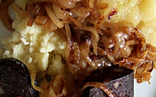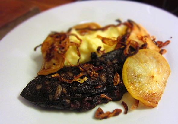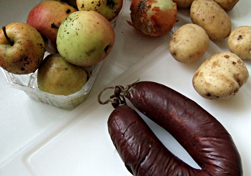 Ich esse oft Blutwurst. Doch seit dieser Abendesseneinladung habe ich vermehrt über Verpackungsmöglichkeiten für dieselbe nachgedacht. Schließlich bin ich gedanklich bei einer Variation des beliebten Themas „Himmel un Ääd“ gelandet – und habe gestern Abend den rheinischen Vierklang von Kartoffel, Apfel, Zwiebel und Blutwurst folgendermaßen umgesetzt: