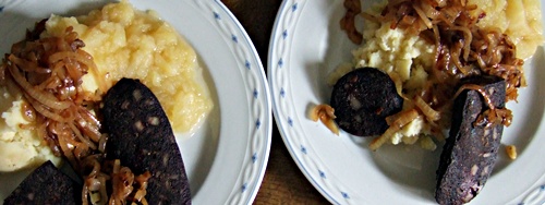 Zwei Töpfe, zwei Pfannen. Kartoffeln und Äpfel schälen, mit wenig Salz und etwas mehr Zucker und jeweils Wasser garen und zu Pürree (unter Beigabe von Milch, Muskat und Butter) und Kompott (mit nichts weiter) verarbeiten. Zwiebeln karamellig braten. Die Blutwurst halbieren, mehlieren (muss leider sein) fast kross werden lassen.