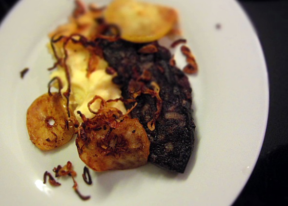 Mehlige Kartoffeln gekocht, gepresst und mit einem Ei, Kartoffelstärke und wenig Weizenmehl zu einem weichen Teig verarbeitet. Mit Salz und Muskat gewürzt und für eine Stunde in den Kühlschrank gelegt. In der Zwischenzeit ein Kompott von roten Zwiebeln gekocht, mit braunem Zucker, Salz und etwas Nelke sowie reichlich Spätburgunder. Wenn der verkocht, mehrmals aufgefüllt und mit einem Schuss altem Balsamico abgeschmeckt. Frische, gut gewürzte Bioblutwurst in dicke und eine Rubinette in dünne Scheiben geschnitten.