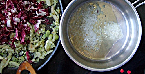 Dann der Fisch. Pesce spada kann eine ganz schöne dröge Angelegenheit sein, gart er nur einen Moment zu lang. Schlimmer als toter Thun. Der gemeine Süditaliener grillt ihn kurz, in Scheiben geschnitten. Frau Hazan empfiehlt eine einem Kalbsschnitzel entsprechende Behandlung. Ich gebe säurebetontes Olivenöl in die heiße Pfanne und die circa 1,5 cm dicken Scheiben unbehandelt dazu. Drei Minuten von jeder Seite, nach dem Wenden Fleur de Sel, Pfeffer und Zitronenabrieb. Und einen Schuss Wein zum nun zischenden Fisch. Das stoppt den Garprozess und gibt geschmacklichen Bumms. Der Tag ist nicht gerettet. Aber deutlich weniger grau.