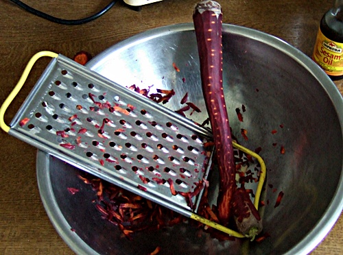 Schlechtes Foto, zugegeben. Aber prima Salat: Purple Haze gerieben, ebenso etwas Ingwer. Sesamöl, Zitronensaft. Salz, Pfeffer, beides grob. Walnüsse. Perfekt.
