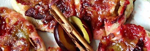 Sechs übermäßig gehäufte Löffel Weizenmehl mit etwas Zucker in eine Schüssel geben, in die Mitte eine Mulde für warme Milch und frische Hefe. Nach 20 Minuten verrühren, dann zwei Eier, etwas Joghurt und eine Prise Salz zugeben, wiederum gehen lassen. Dann sollte der Teig blasendurchwirkt und zähflüssig sein. Währenddessen ein gutes Kilogramm Pflaumen waschen und an der Fruchtnaht aufschneiden, entkernen. Schließlich in eine große, mittelheiße Pfanne vier kleine Kellen Teig geben (so ergibt dies ca. 16 Stück), mit Pflaumen belegen. Nach guter Bräunung wenden und nochmal halbsolang backen (zu lange = Zerfall; zu kurz = roh).