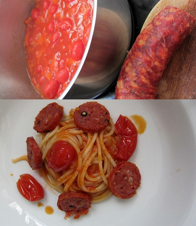 Wohnte ich noch in der großen Stadt, würde ich über solch abenteuerliche Eskapaden kaum müde grinsen, wäre aber deutlich weniger fit – und die frische Landluft erst. Einerlei, es gab als Belohnung also Nudeln mit Wurst und Tomaten. Letztere in Form von pomodorini di collina aus der Dose, ebenfalls erradelt.