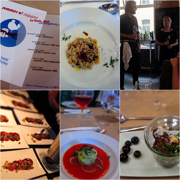 Der plakativste Gang, weil er so hübsch mit der Erwartungshaltung der Gäste spielte, waren die Gurkenspaghetti auf Erdbeermark mit Oliven. Erst bei halbleerem Teller gelang es, die Idee „Tomate“ aus dem Hirn zu essen. Der Rosé von Enderle & Moll passte dazu unverschämt gut. Genauso bestechend waren die nussig bunten Beete, denen Torsten einen Vin naturel von der Ardèche an die Seite gestellt hatte. Dessen vordergründiger Lösungsmittelcharakter wollte erst einmal bezwungen werden – bis er dann zur Gaumengranate wurde. Wein des Abends. Vorher und nachher noch ein paar Biere vom Brauprojekt 777, die Gänge 4 und 5 (Erbsen und Avocadoschokomousse) für die genussvolle Sättigung und allerlei gastrosophische Gespräche ließen uns beschwingt von dannen ziehn. Satt und glücklich und voller Liebe.